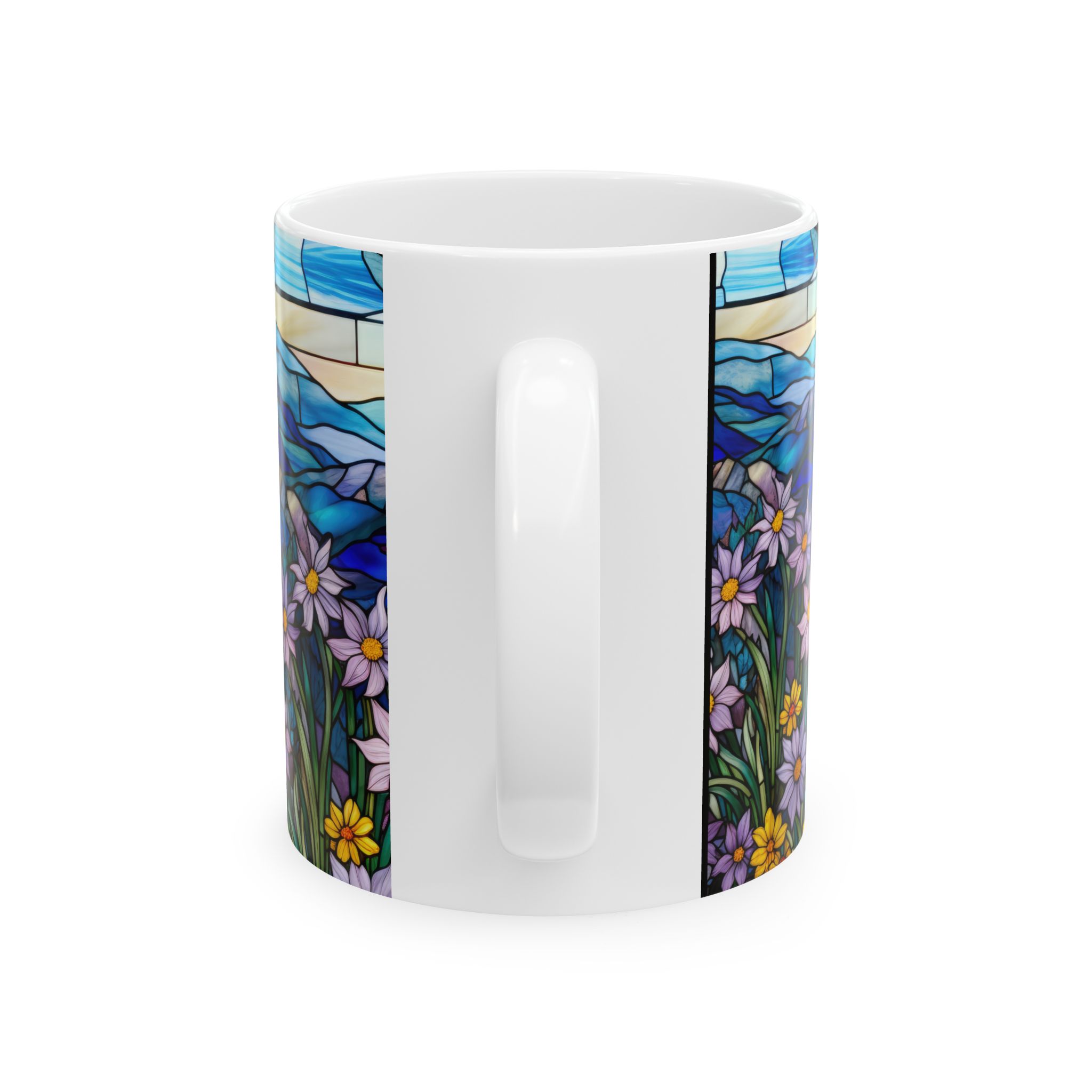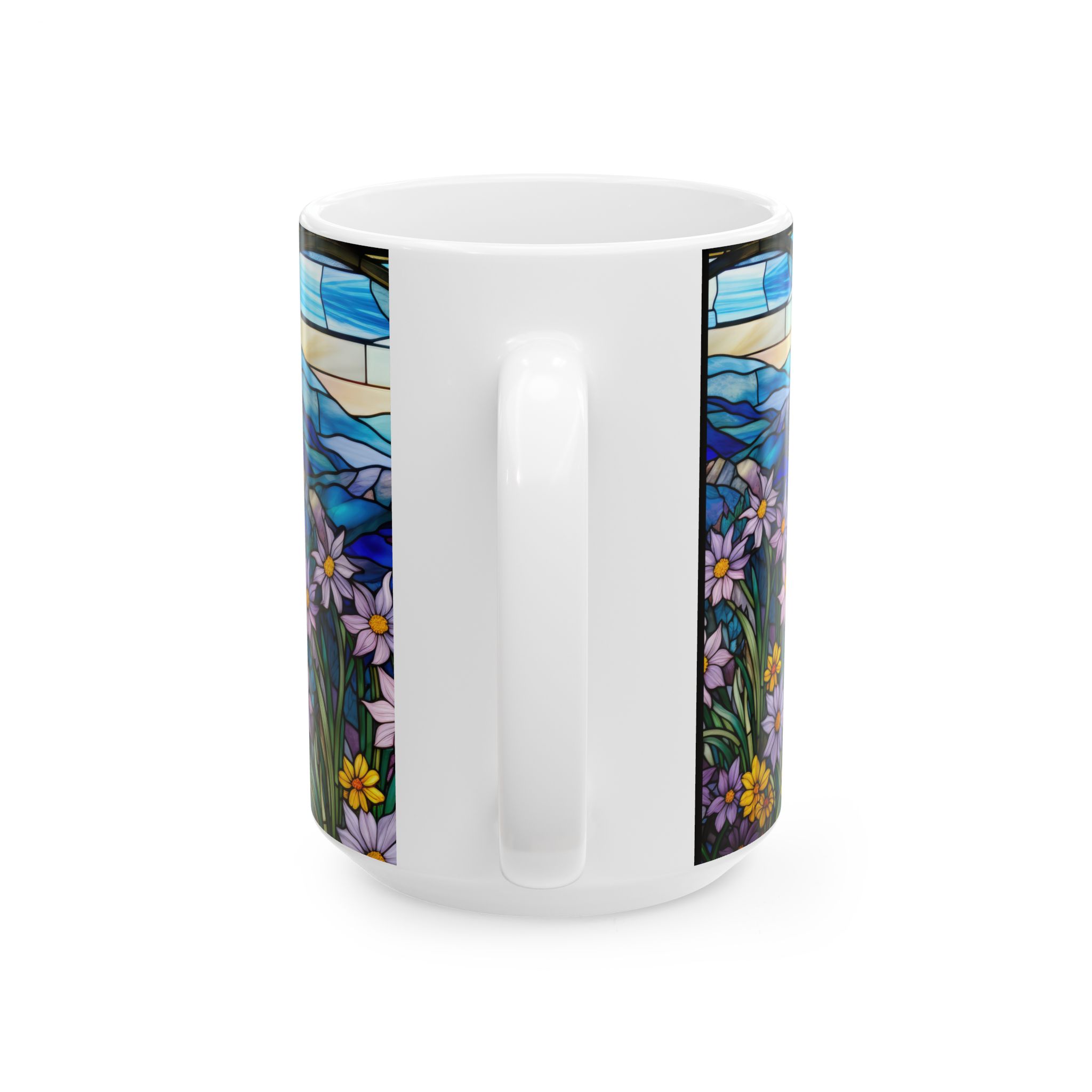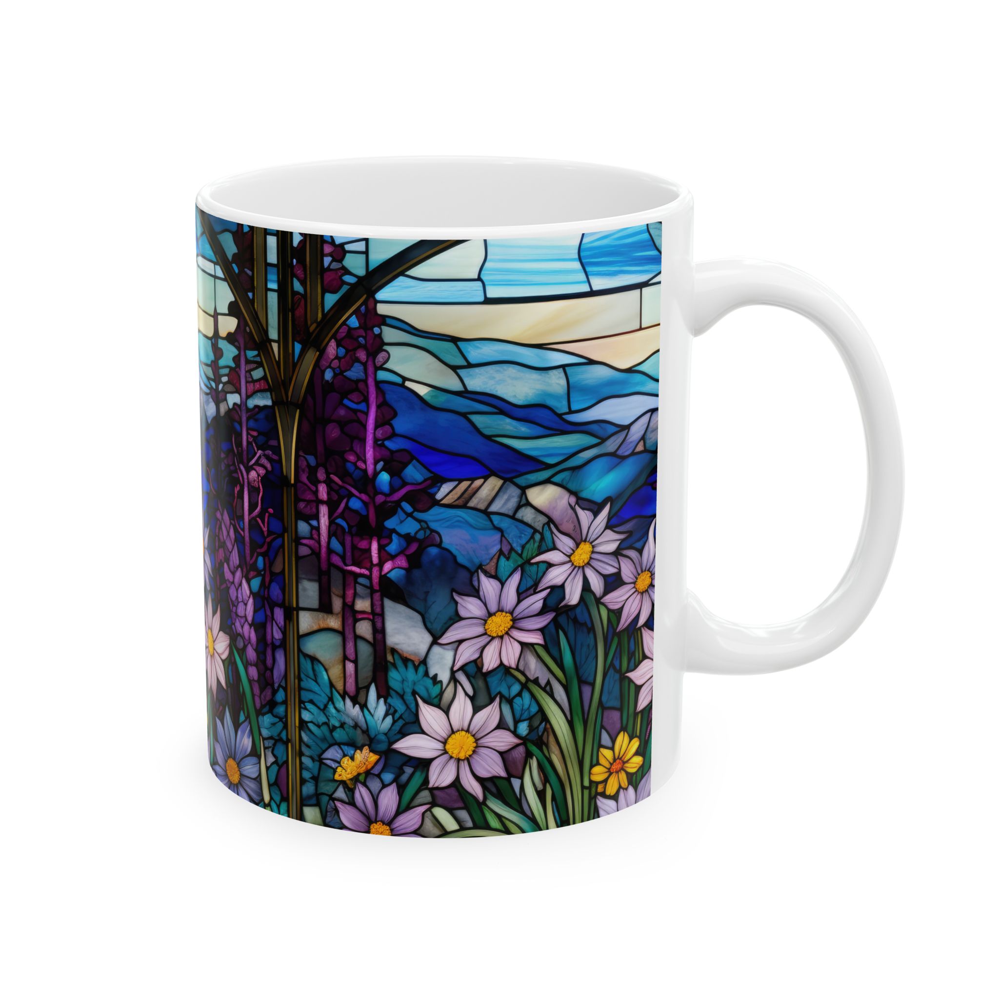 This stained glass mountain floral coffee mug features vibrant daisy artwork and rich landscape detail on durable ceramic. Perfect for coffee, tea, or gifting.