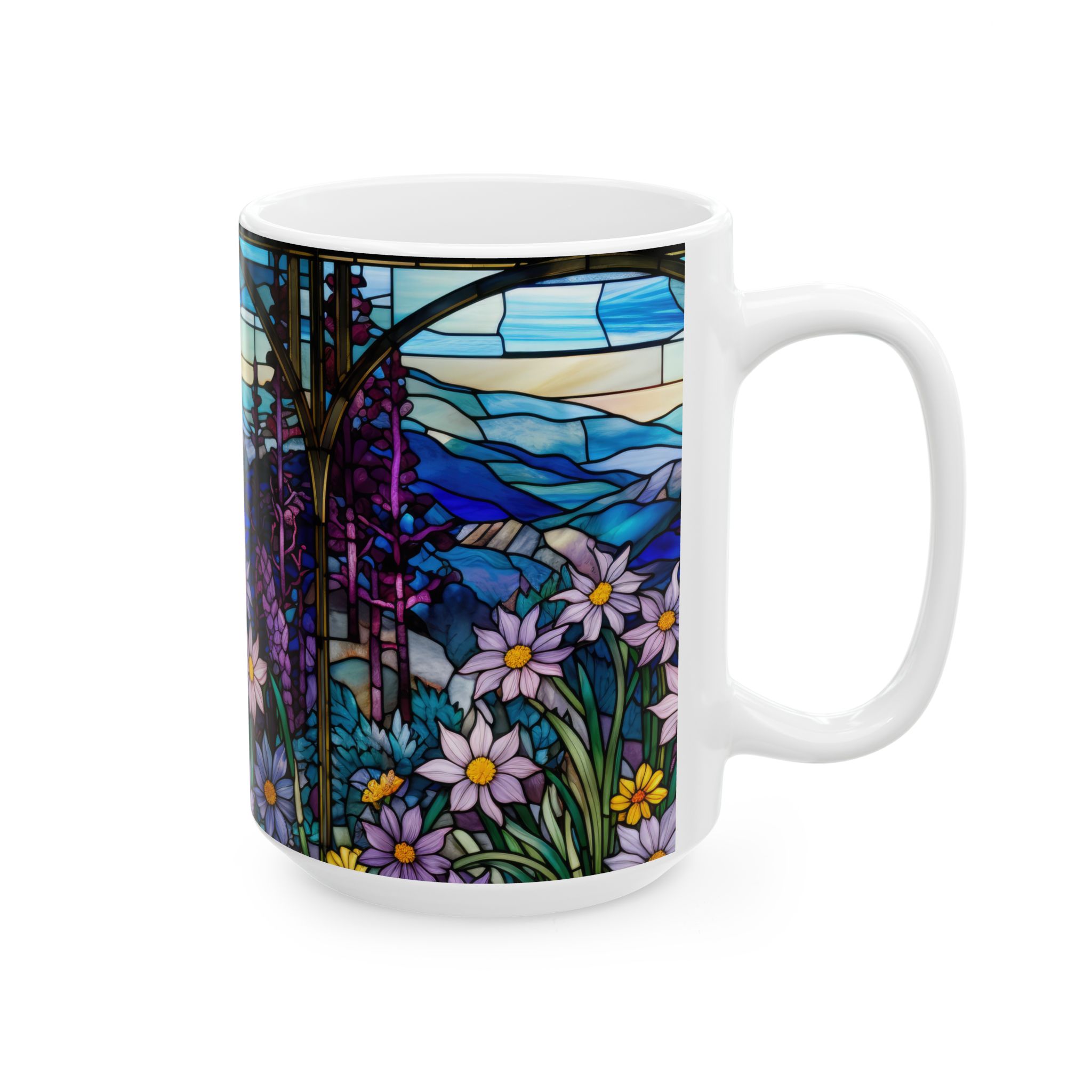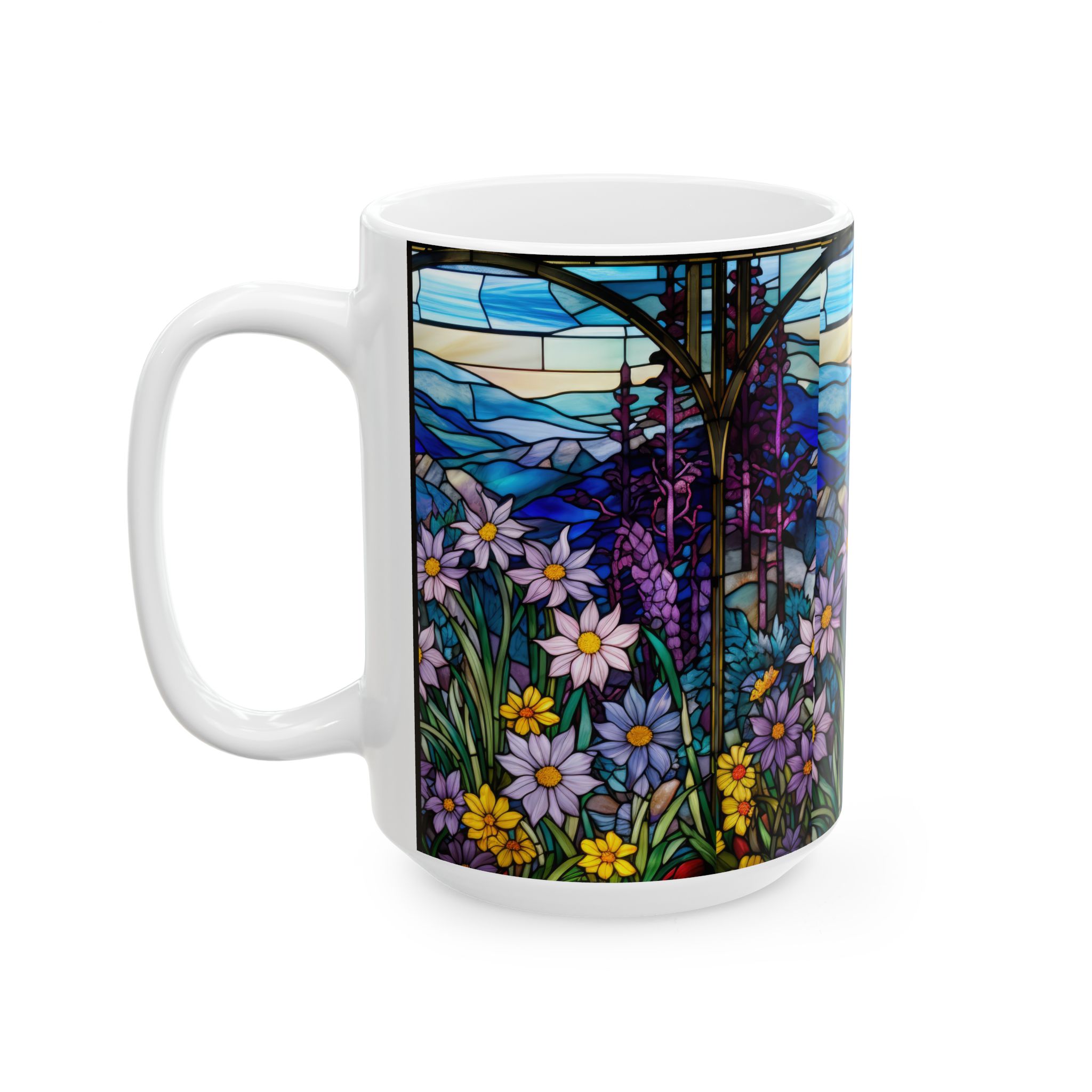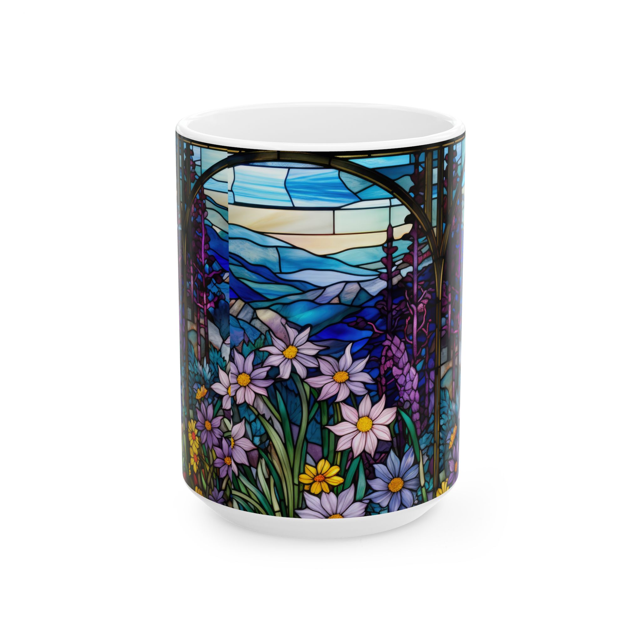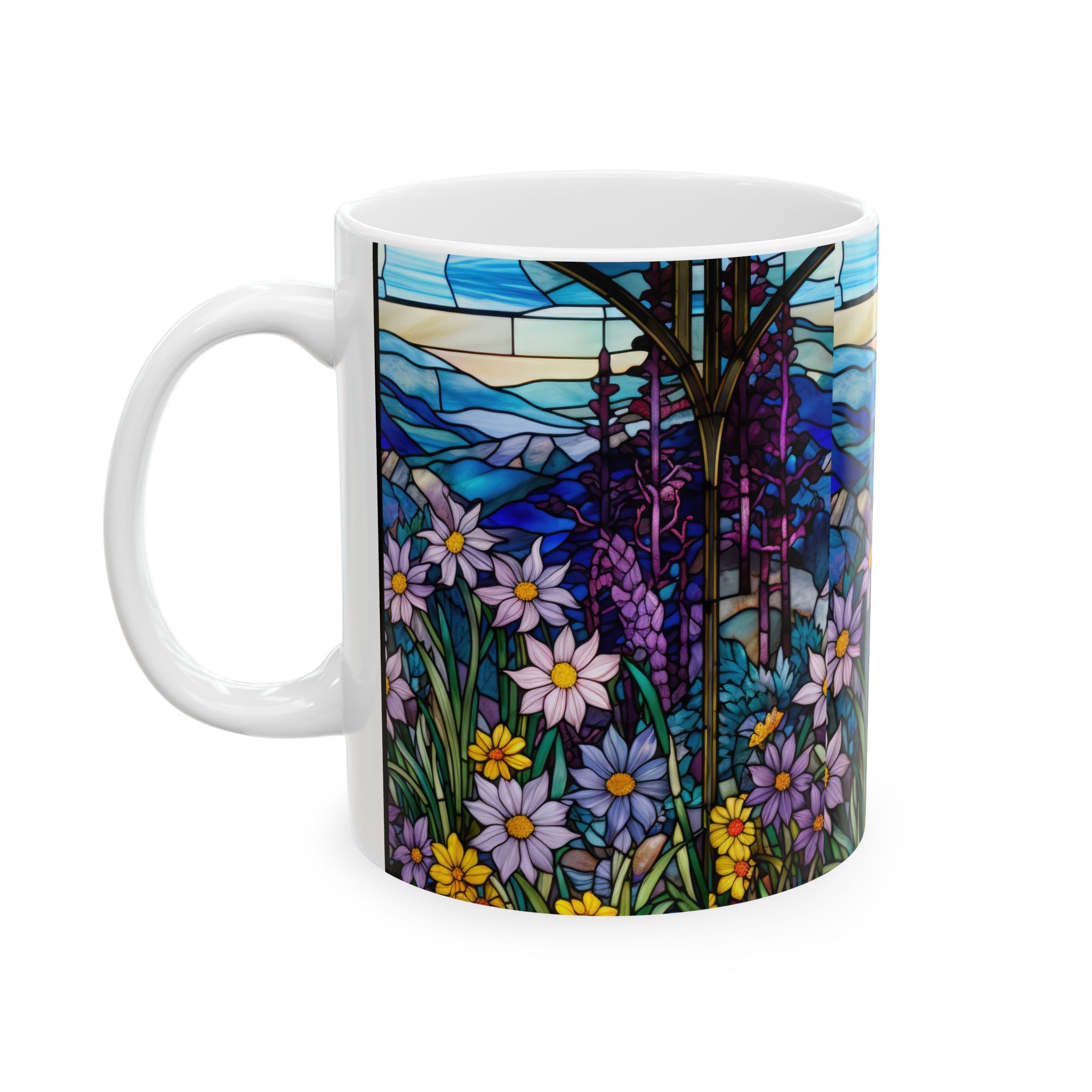 This stained glass mountain floral coffee mug features vibrant daisy artwork and rich landscape detail on durable ceramic. Perfect for coffee, tea, or gifting.